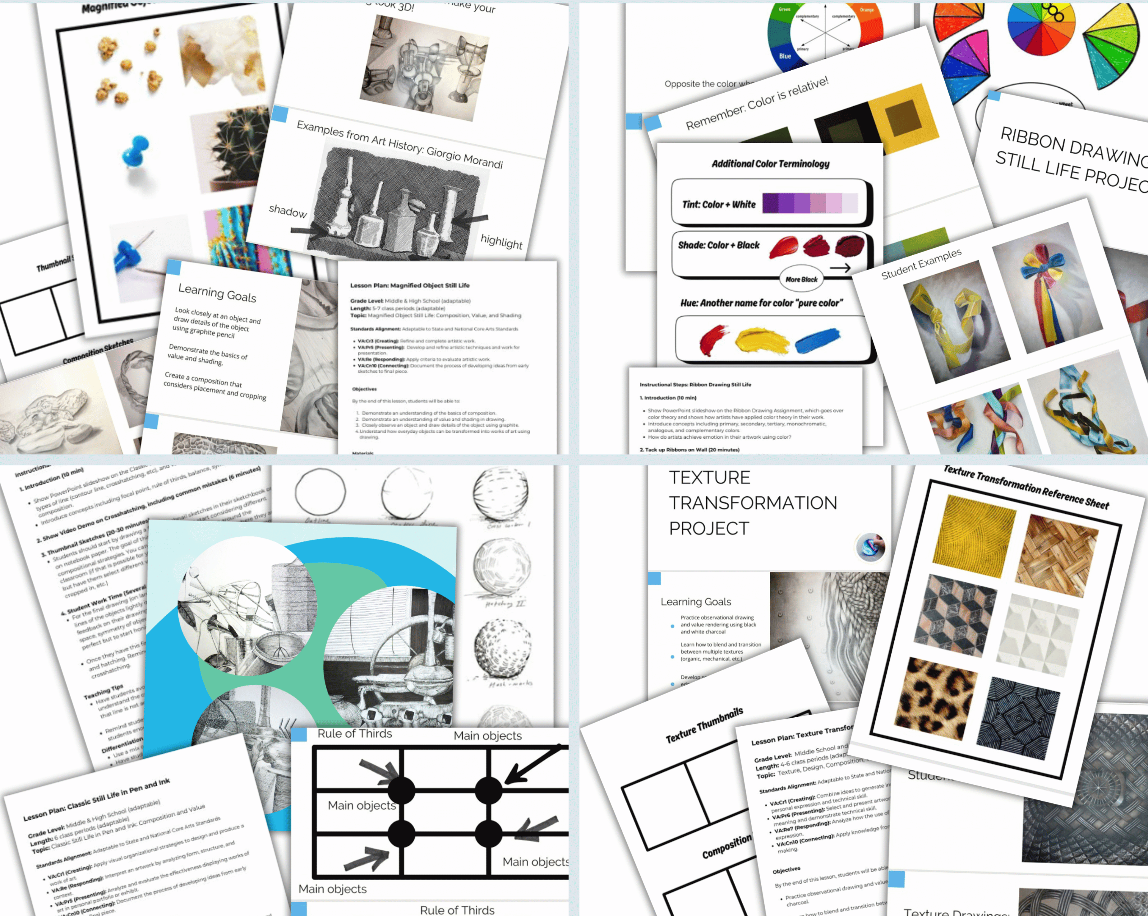 A few fan favorites: the ribbon project gets stunning results every time. The texture transformation project helps students look closer and find beauty in the every day. The experimental portrait helps students expand their creative and artistic vocabulary with pattern and geometrics. Each project includes a slideshow, lesson plan, rubric, and most include extra resources that help scaffold a successful lesson.
