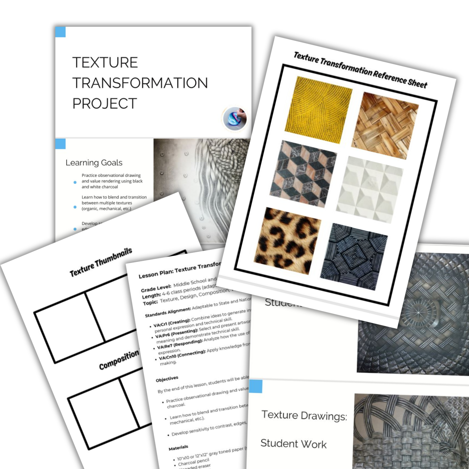 11-page slideshow presentation in PowerPoint and PDF, and 4 student work examples. This project works well as a bridge between realism and abstraction, and teaches/reinforces concepts such as composition, value, and line. 3-page lesson plan with student learning objectives, standards-alignment, instructional steps, material list, teacher tips, and assessment rubric. Texture Transformation Cheat Sheet